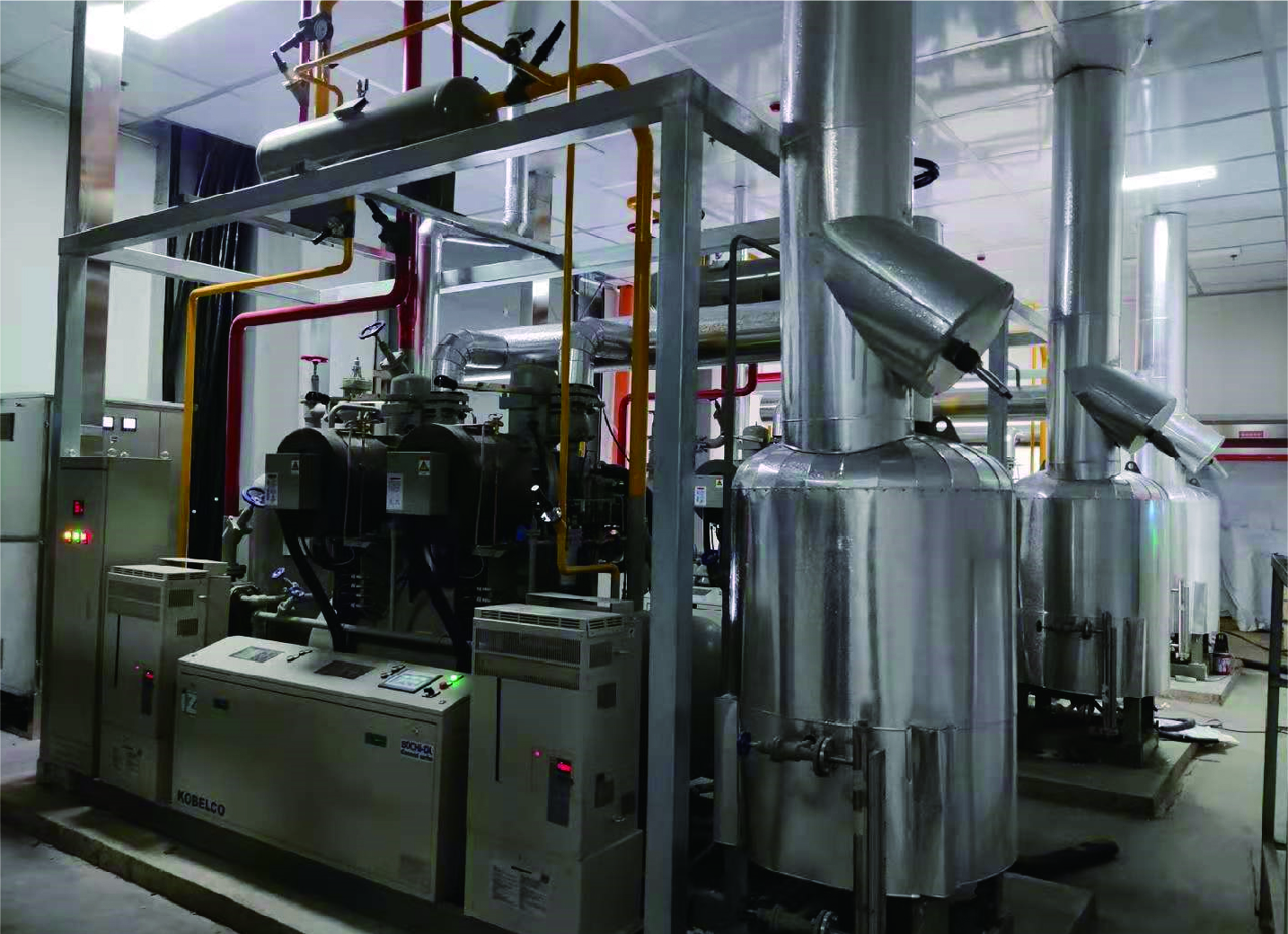 技術(shù)實(shí)現形式:神鋼變頻螺桿并聯(lián)機組,上海寶豐蒸發(fā)冷,全自動(dòng)控制。